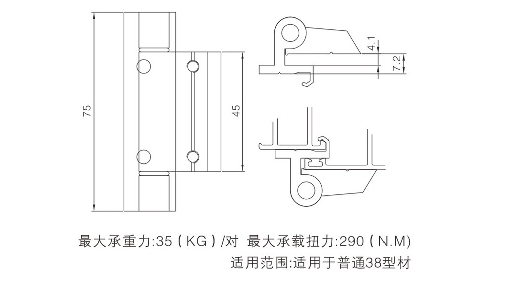適用于38型材上,每對最大承重35(KG),最大承載扭力290(N.M)