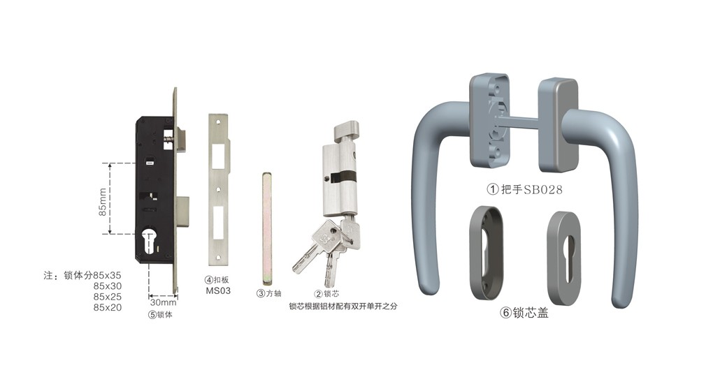 平開門鎖,把手與鎖芯蓋分體設計。實用簡潔大方。鎖芯、扣板可按客戶需求選配。